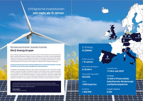Q-Energy ist einer der größten Fondsmanager mit dem Fokus auf Erneuerbare Energien, Energiewende und nachhaltige Infrastruktur-Projekte. Die Broschüre umfasst 16 Seiten.